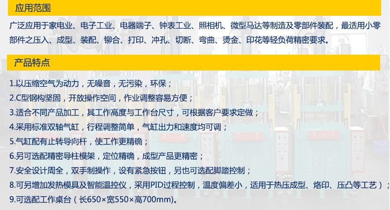广泛应用于小零部件之压入、成型、装配、铆合、列印、冲孔、切断、变曲、烫金、印花等轻负荷精密要求