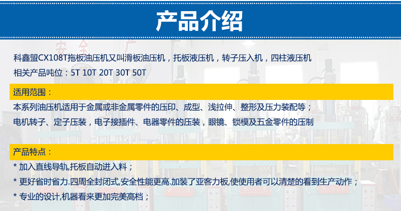 本系列油压机适用于金属或非金属零件的压印、成型、浅拉伸、整形及压力装配等;