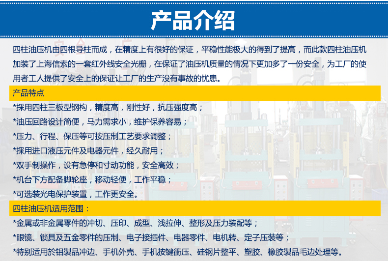 科鑫盟油压机,精密四柱三板液压机,10吨四柱油压机,20吨油压冲边机,铝镁制品切边机,金制品冲边机,按键切割机采用四柱三板框架式结构,先进的子母缸液压回路,无论是噪音,速度, 耗电功率均优于普通液压冲床;是款高效率高速度,高出力,高环保的新一代液压冲床本机在压铸行业应用最为广泛。
